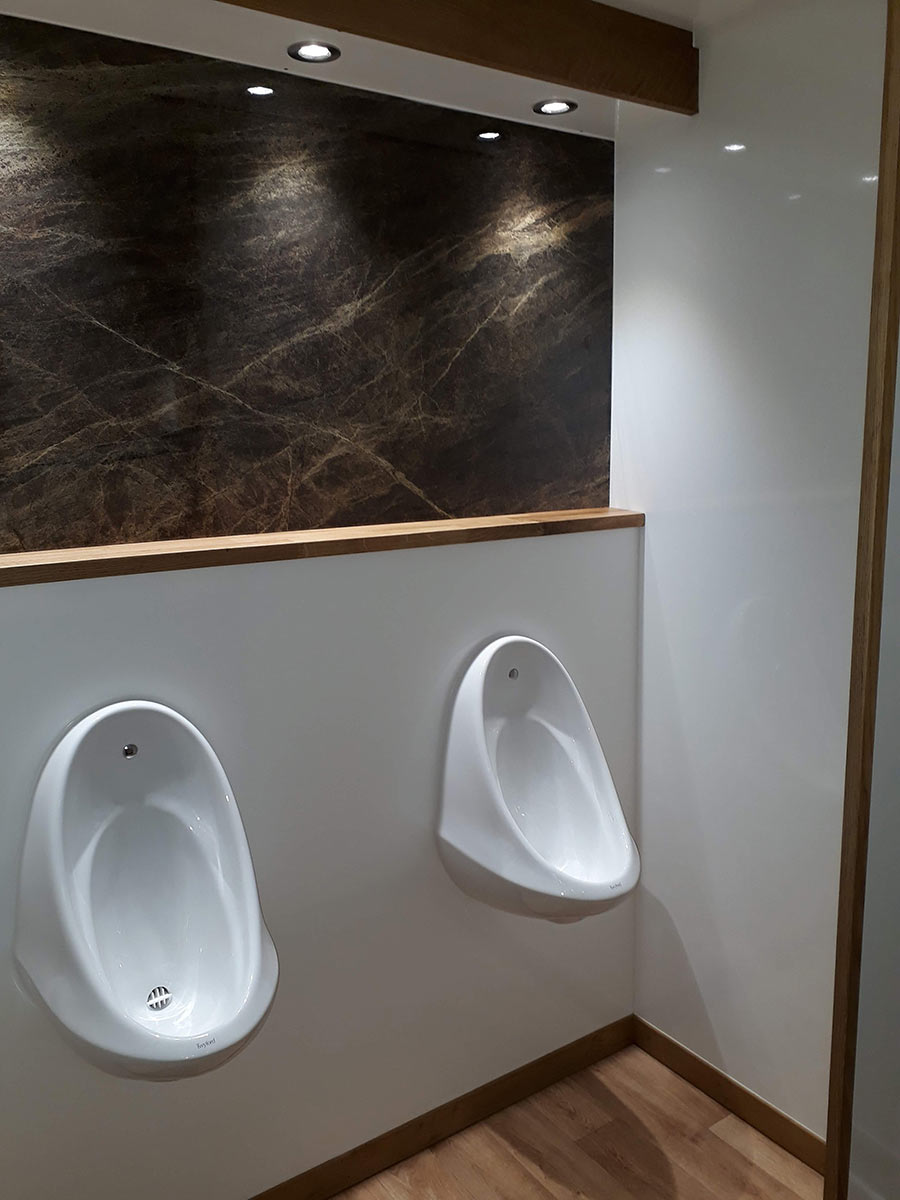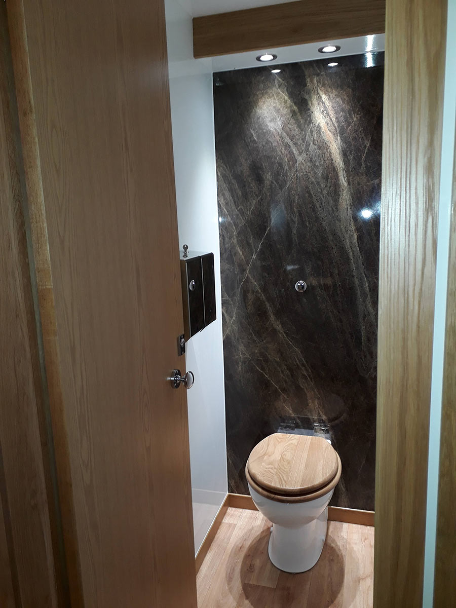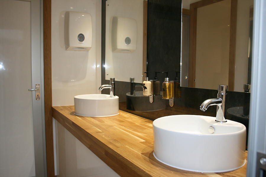 Trailers contain top end interior fittings, including white porcelain sinks, chrome taps, large mirrors, bright interiors, down lighting, wood-effect laminate floors, hand bag/coat hooks on cubicle doors, paper hand towel dispensers. All furnishings provide a contemporary sleek look.